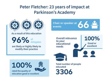 Dr Doug McMahon, one of the four founder members of the Parkinson's Academy, who has known Peter since 1987 when they began working together, paid tribute to Peter's extraordinary contributions: "Peter has been absolutely instrumental in improving clinical practice throughout our careers. The impact of the MasterClasses has been astonishing, with assessments showing 100% of participants rating them as good or excellent, 100% finding them relevant to clinical practice, and 96% reporting a high probability of improving their practice".