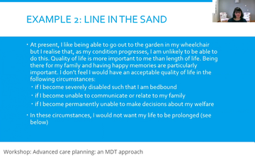 She also gave examples of how she might write clear statements within someone's advance care plan, highlighting that statements around what is wanted or what is not wanted should be written in preference order as shared by the individual.