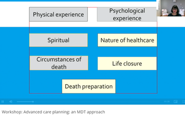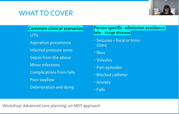 Lorraine closed the session with her tips on completing an ACP, and some examples of unintended circumstances caused by unclear or incomplete planning documents. She also highlighted that it is essential not to inadvertently sign a patient out of treatment that they may wish to have, for example, treatment for minor infections during a hospital stay whilst they still experience good quality of life generally, versus at a time when their 'line in the sand' has been drawn and they would choose not to have further treatment.