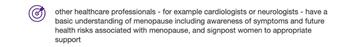 Other healthcare professionals – for example cardiologists or neurologists – have a basic understanding of menopause, including awareness of symptoms and future health risks associated with menopause, and can signpost women to appropriate support