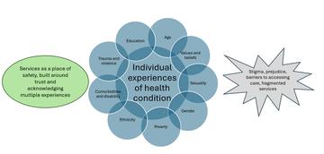 Figure 4: Infograph created by Suzanne Britt demonstrating the intersecting factors influencing individual experiences of a health condition.