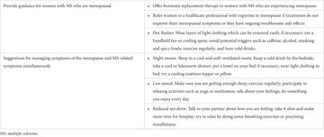 Underpinning all of this is the need for appropriate lifestyle advice during perimenopause and menopause. An explanation of the stages of menopause needs to be shared with women, along with the benefits and risks of lifestyle management and therapeutic options for menopausal symptoms to complement any potential medication changes. Some strategies have been suggested for managing MS and menopause related symptoms concomitantly (Giovannoni et al 2024) (figure 6).