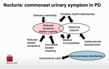 He said that nocturia is 'the elephant in the room' in Parkinson's clinics, with 78% and 65% of Parkinson's cohorts in 2 respective studies found to experience it (Smith et al 2015; Romain et al 2015). Commenting on some of the contributing or causal factors in nocturia, he reminded the room that not all bladder problems are located in the bladder - some are caused by changes in the brain. He cited the damage to the parts of the brain responsible for facilitating circadian rhythms in Parkinsonian conditions (Pablo-Fernandez 2018) and noted a pilot study to manage nocturia in Parkinson's using melatonin (Batla 2016).