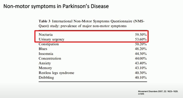 There is evidence of worsened motor symptoms correlating with urinary problems such as overactive bladder, voiding difficulties and nocturia, even at the point of diagnosis (Mito et al 2018).