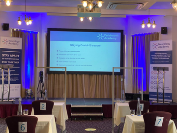Staff safety is also important, and on-site staff are using screens for protection when in situ, whilst their Parkinson’s Academy face masks help delegates identify them quickly outside of the main meeting space.