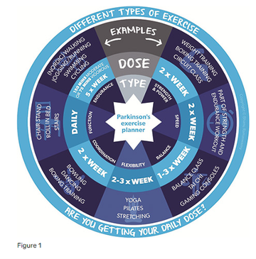 Sharing a helpful 'exercise wheel' (figure 1) they provide practical PA prescriptions for people newly diagnosed with Parkinson's, before establishing an appropriate prescription for maintenance and complex stages of the condition.