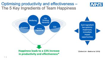 Matthew spoke of the importance of making small changes which can have a big impact on a team's productivity, effectiveness, calmness and wellbeing, and offered to share an existing list of proven marginal gains with anyone who is interested. Ensuring that every individual within a team understands 'what to do and how to do it' is important, as is considering the five elements which lead to 'Team Happiness' including kindness, EDI - equality, diversity and inclusion, wellbeing, process engineering, and a flat thinking hierarchy.