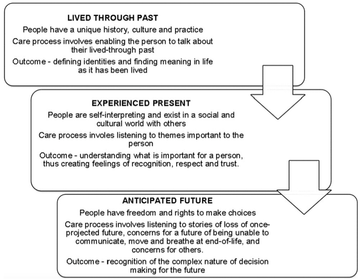 'The overall aim of this paper is to provide practical insight into the way that professionals caring for a person with motor neurone disease (MND) can recognise, respect and respond to that person's temporality; that is, the person that they have been, that they are now and that they will be in the future.'