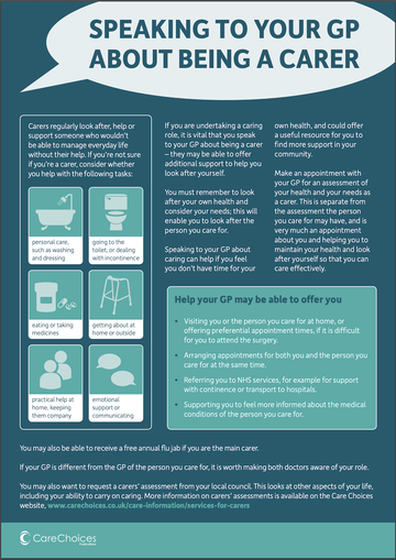 Flyer from Care Choices encouraging people who may have a caring role to speak with their GP about different support available