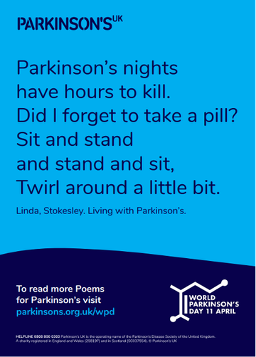 This year, volunteers have selected two core themes for World Parkinson's Day: Light up Blue, and Poems for Parkinson's. People are invited to create a blue window display at home, light up their businesses, or share a poem about their experiences, like this one: