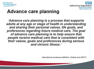 Beginning with a definition of advance care planning from NICE (2019), Tim shared a quote: