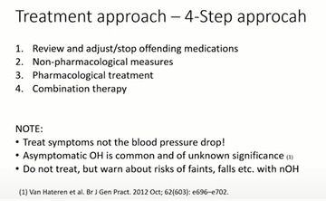 Norman then spoke about medications for orthostatic hypotension ‒ largely midodrine and fludrocortisone in the UK. Norman usually starts with a low dose of midodrine and titrates slowly upwards. Fludrocortisone is off-label for orthostatic hypotension, but, as with midodrine, there is NICE guidance. Pyridostigmine and droxidopa may also be valuable for some patients. As regards reducing the risk of supine hypertension with antihypotensive drugs, he said, the main precautions are to avoid taking antihypertensives and also lying down during the day. Norman added that the risks of supine hypertension are not as severe as was once thought. He summarised the treatment of orthostatic hypotension in the following slide:
