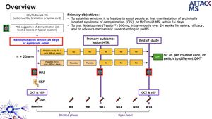 AttackMS is a placebo-controlled phase IIa trial of Natalizumab within 14 days of a first demyelinating event. The primary outcome is lesion MRI magnetisation transfer (MT) ratio, an index associated with myelin content. We hypothesize that highly effective blocking of inflammation within this such a short time frame will facilitate brain repair (remyelination) and ultimately reduce the likelihood of chronic disability accrual. For AttackMS to become a success, the management of early MS will need to change from a non-acute elective setting to an approach resembling the treatment of stroke.
