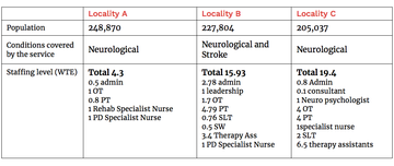 Locality A had a very small team who saw patients with neurological conditions excluding stroke as there was a separate stroke service, Locality B had a larger team however their services covered patients with neurological conditions including stroke i.e. larger number of patients, and locality C had good staffing level who cover neurological excluding stroke as they also had a separate stroke service.