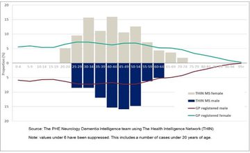 Figure 1: Multiple Sclerosis – age distribution of new cases of MS and GP registered population by sex (financial years April 2012 to March 2017 for new cases, 2017 for registered population, England) 5