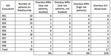 There was some variance amongst consultants, and in general the consultants who had more patients on natalizumab were the ones who appeared to be more likely to have outstanding MRIs to book, this may indicate potential capacity issues and the need for an alternative system.