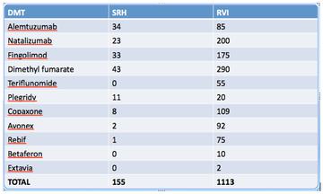 The total number of patients ever registered to have MS on the SRH database is 868. The number of patients on each disease-modifying therapy at SRH compared to the RVI, as of January 2017, is as follows: