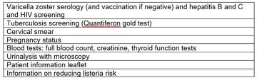 - Full blood count (FBC), creatinine, urinalysis with microscopy (monthly)
