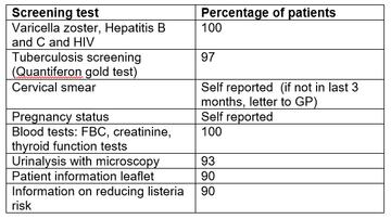 Some minor points that could be improved upon are that a significant number of urinalysis tests were missed and that pregnancy and smear results rely on patient self-reporting (although information about this is provided in the patient information pack). All patient had an MRI in the year prior to treatment. However, more patients could have one +/- 3 months of starting, rather than at 6-12 months, as this gives less useful information, being neither a baseline scan or an annual follow up scan.