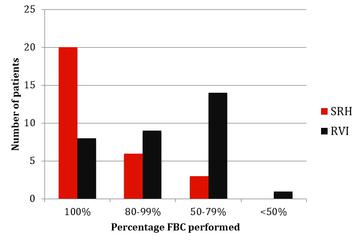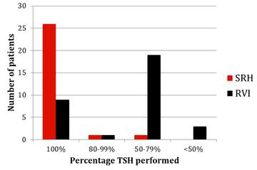 The results of monitoring of FBC, creatinine, thyroid function (TSH) and urinalysis are shown in figures one to four. Most patients at SRH had 100% of their blood monitoring completed. This was significantly better than the results from the RVI. Most patients had 80% or more urinalysis performed, again, outperforming the RVI.