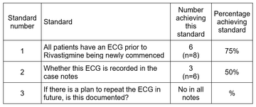 It was also felt that an aide memoir/rivastigmine initiation proforma would facilitate good record keeping. Hence a proforma was created (see appendix 1.). This will be utilised in the clinic going forward. It will be placed in the notes and should raise compliance with the checking of ecgs and facilitate future data collection.