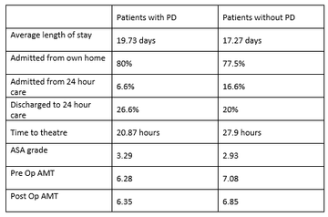 A retrospective review of 18 months of data from our trust’s national hip fracture database was reviewed. This covered the period January 2015 to June 2016. This data includes information on: length of stay (LOS), discharge destination, time to surgery, performance status (ASA) and cognition (pre- and post-operative AMT [abbreviated mental test]). A sample of case notes of patients with Parkinson’s was also reviewed in more depth.
