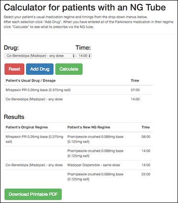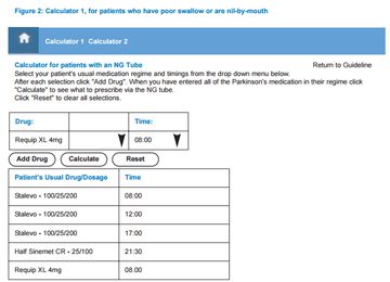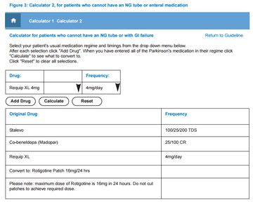 It doesn’t stop there. Once a guideline has been located, using the accompanying tables or algorithms to convert patients’ usual medication to a dispersible preparation via a nasogastric (NG) tube or to a parenteral alternative can be arithmetically challenging even for Parkinson’s specialists, and vulnerable to error. A nationally available guideline with an electronic drug conversion calculator has the potential to address these clinical issues, and provide an educational resource for Parkinson’s specialists and nonspecialists alike.