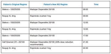 Worked examples are shown below for a patient who usually takes Stalevo 100/25/200 three times daily, Requip XL 4mg once daily and Half-Sinemet CR nocté. Figure 2 (below) demonstrates use of Calculator 1 to convert the patient to preparations that can be passed down an NG tube if their swallow is poor or they are nil-by-mouth, with attention to timings.