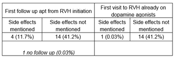 This was a retrospective notes study. From the 220 sets of notes of patients attending the Parkinson’s clinic at Royal Victoria Hospital, Dundee, 34 were identified as being currently on Ropinerole, Rotigotine or Pramipexole. I went through the notes taking information from the GP letters and the UPDRS score sheet which is completed for each of our patients at their annual review.