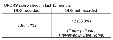 I looked specifically for mention of ICD at initiation of treatment, and the first follow up appointment and then at their last review appointment. I then reviewed all the UPDRS sheets to check for completion of the Dopamine Dysregulation Syndrome box.
