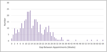 The median gap between patient’s appointments was 13 weeks (range 0 weeks to 64 weeks)