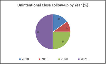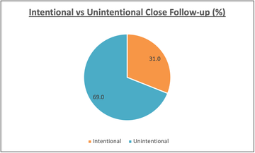 Further analysis of those patients who had an unintentionally close follow-up showed that 75% of these occurred during the pandemic (2020 – 2021).