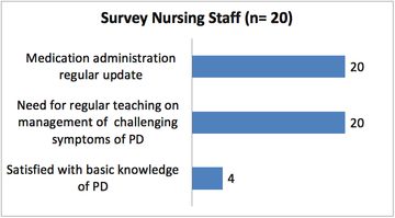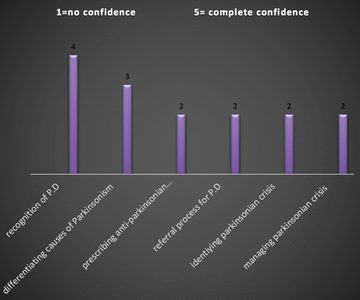 We recognised that while most junior doctors were confident in identifying P.D , Junior doctors were not as confident in prescribing anti-parkinsonian medications, identifying a parkinsonian crisis and managing a parkinsonian crisis. Junior doctors also were not familiar with the referral process for PD within the trust. Nursing staff lack completely in knowledge regarding management of challenging symptoms of PD. 20/20 asked for regular update on medication administration and they were also very keen to learn about basics of PD. When asked for suggestions on how to improve the level of PD related knowledge among junior doctors, the 3 most popular suggestions were: (1) lectures (2) e-learning resources and (3) incorporation of PD educational sessions as part of weekly junior doctor teaching.