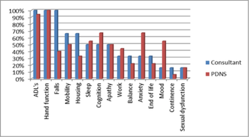 More interestingly were the reasons for referral. These were predominantly physical and motor issues. The majority referring for reduced ADL’s and hand function. The numbers who were referring for mental health and fatigue issues were reduced. Only 16% of the replies stating they would refer to OT for issues around Sexual Dysfunction.