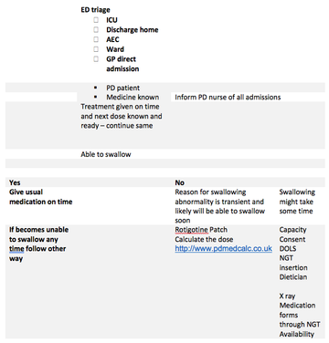 Develop local guidance and a pathway for acutely admitted PD patients.