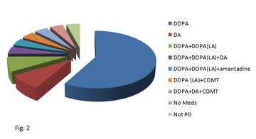 The patients were also on a wide variety of medication regimens although the majority were on single agent sinemet or madopar. One case was on no medications as they had all been recently stopped by their GP with no reason given and another was an incorrectly coded patient with benign essential tremor.