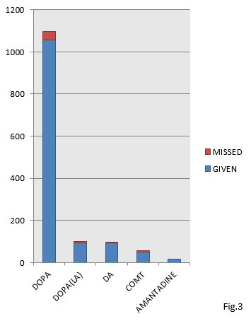 I reviewed all the drug charts to see if drugs had been properly prescribed on admission and to see if any doses had been omitted. All the drug charts reviewed had “Give On Time” stickers on the front and in general adherence to regimens was good. Out of a total of 1,316 doses to be given only 51 were missed. The majority of missed doses were of sinemet/madopar (fig. 3 and fig. 4).