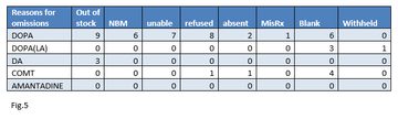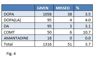 Finally I looked at examples of good and bad practice. Generally I found that there was good awareness that drugs needed to be given correctly and effort was made to ensure regimens used at home were kept up in hospital. Orthopaedics made the best use of the PD nurses but the service is still underused. It was pleasing to see very few missed doses due to NBM. There was a single case where a patient had severe hypoactive delirium and was unable to take her medications. She was commenced on a rotigotine patch which resolved her delirium within 24 hours. It was just unfortunate that this measure was only used after 72 hours of her not being able to take her tablets. There were two cases of poor practice, both around end-of-life care. Both patients were described as being too unwell to take medications and were left untreated for their final days. Without seeing the patients at the time it is difficult to comment whether or not a parentral treatment such as a rotigotine patch might have given them a better quality of life in their final days but my personal feeling is that it would.