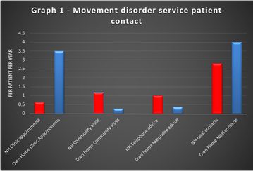 The care home patients generated 41 clinic appointments in the previous year, equating to 0.63 appointments per patient per year. They received 65 telephone advice calls and had 76 community visits by Parkinson disease nurse specialists (1.17 visits per patient per year). The sample of non-care home patients had attended 3.5 clinic appointments per patient per year, with 0.27 community visits per patient and 0.36 telephone advice calls per patient per year. (See Graph 1)
