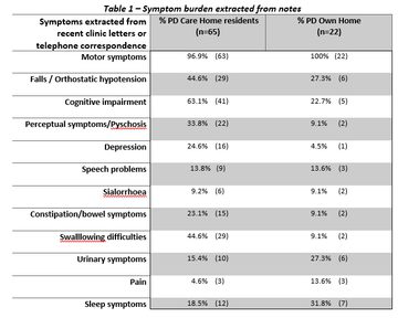 Parkinson’s disease is a progressive neurodegenerative condition impacting significantly on the functioning of patients both through its motor and non-motor features. As the disease progresses many patients through functional and cognitive decline may require care home placement to meet their on-going care needs.¹ These individuals with usually advanced disease are often more challenging to follow-up and are at risk of sub-optimal care, exposed to the risk of emergency hospital admissions and subsequent prolonged hospital stay as a result of the complications of their disease.²