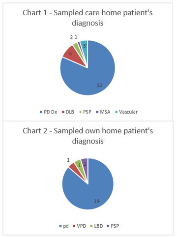 The database identified 1238 patients followed up by the movement disorder services. Of these patients 150 resided in care homes. Sixty-five patients with and average age of 81.1 years were sampled from this population with a variety of diagnoses, the majority (82%) of which were Parkinson’s disease (Chart 1). We subsequently randomly sampled 22 patients, average age 78.2 years who lived in their own home with a similar Parkinson’s disease prevalence as shown seen in chart 2.